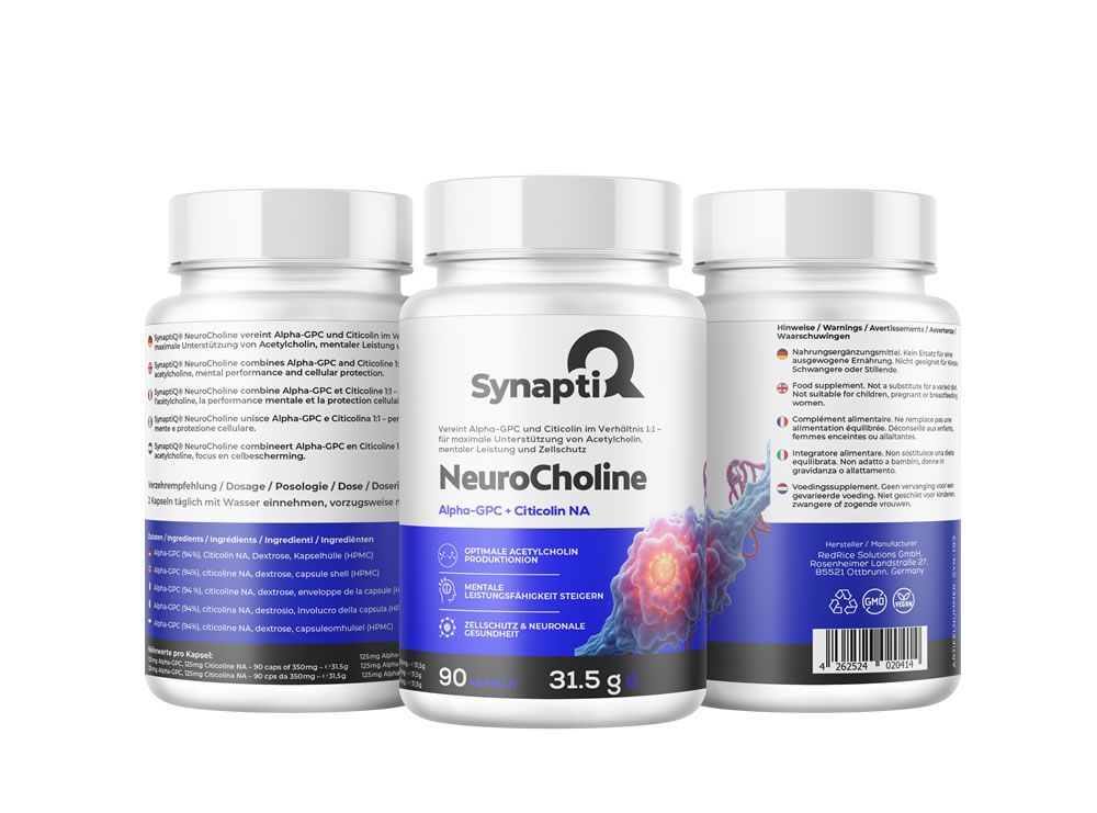 🇳🇱 SynaptiQ® NeuroCholine combineert Alpha-GPC en Citicoline 1:1 – voor acetylcholine, focus en celbescherming.