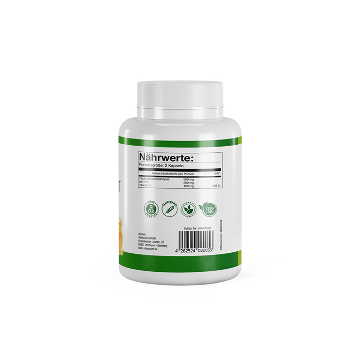 <ul> <li class=“ai-optimize-49″>Nettofüllmenge: 53 g</li> <li class=“ai-optimize-50″>Portionen pro Packung: 45</li> <li class=“ai-optimize-51″>Portionsgröße: 2 Kapseln</li> <li class=“ai-optimize-52″><strong>Aktive Inhaltsstoffe pro Portion:</strong> <ul> <li class=“ai-optimize-53″>Fischkollagenhydrolysat: 600 mg</li> <li class=“ai-optimize-54″>MCT-Öl: 300 mg</li> <li class=“ai-optimize-55″>Vitamin C: 100 mg (125 % RI)</li> </ul> </li> </ul>